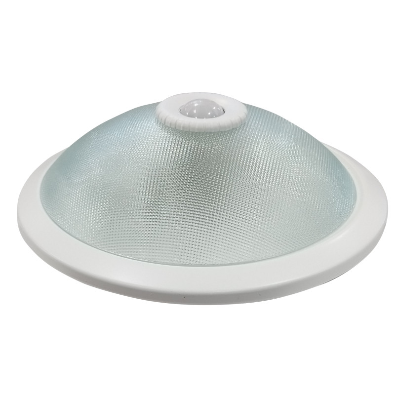 Плафониера със сензор за движение, 2 х Е27, 230V, стъклен разсейвател, за монтаж на таван. Обхват - 360 градуса. Максимално разстояние на действие до 6 m (<24°). Датчикът управлява двете лампи с мощност до 40W всяка. Вътре под стъклото се намират кръговите плъзгачи за регулиране на времето на задържане и чувствителността спрямо външната осветеност. Степен на прахо - и влагозащита - IP20. Работна температура на сензора: -20/+40° C.