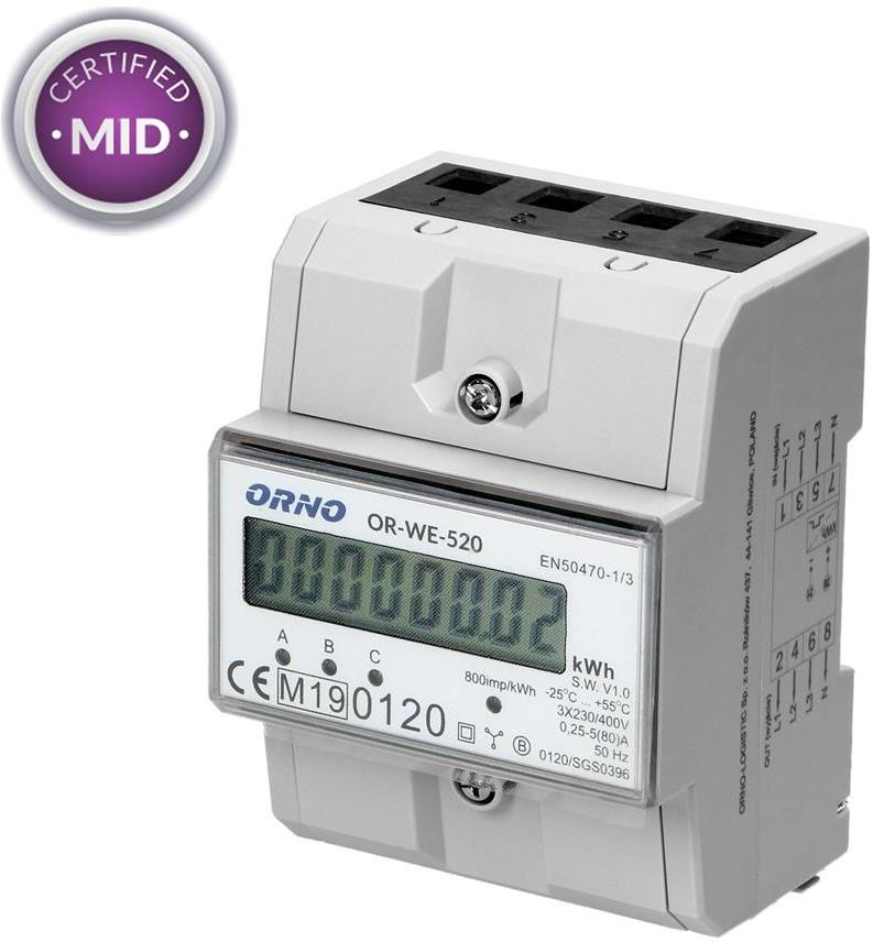 Трифазен електромер за ДИРЕКТНО мерене на ел. енергия, импулсен изход, еднотарифен, за DIN монтаж 4.5 мод, 80A, MID ORNO