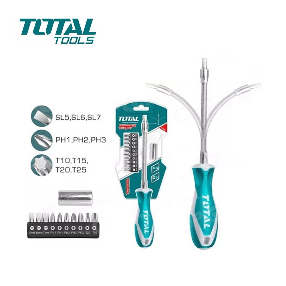 Комплект отвертка гъвкава + битове, TOTAL, SL, PH, Tx, 12 части