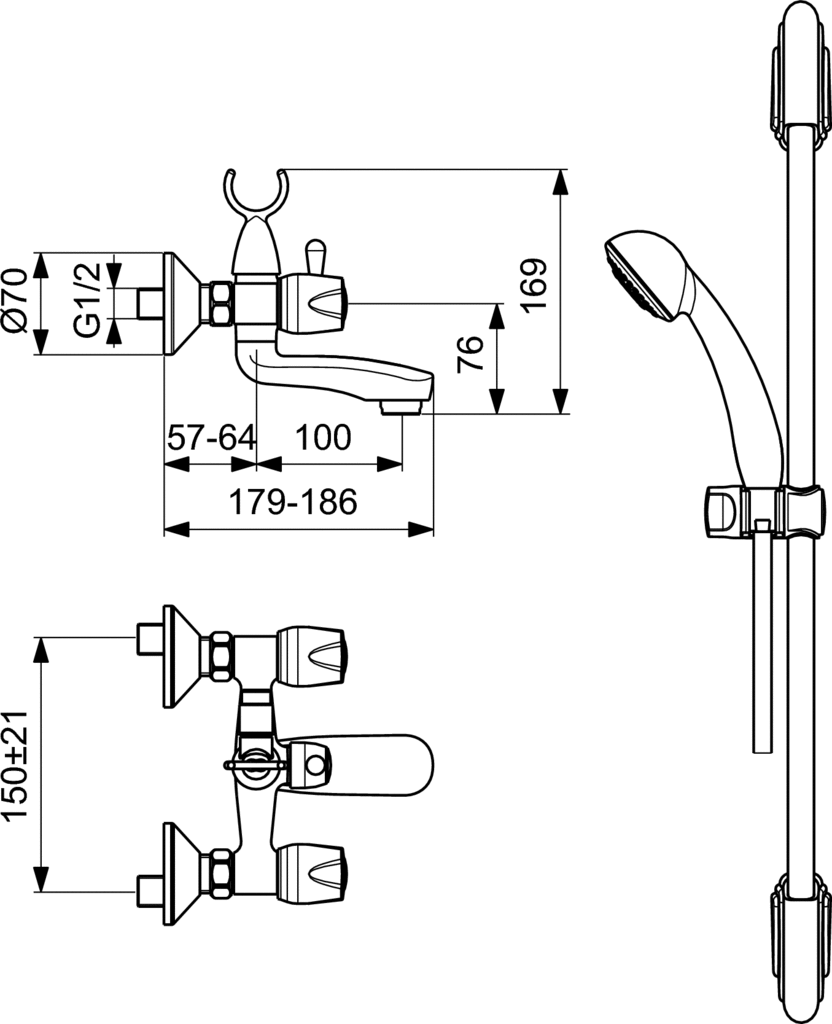 • Смесител стенен за вана/душ с аксесоари
